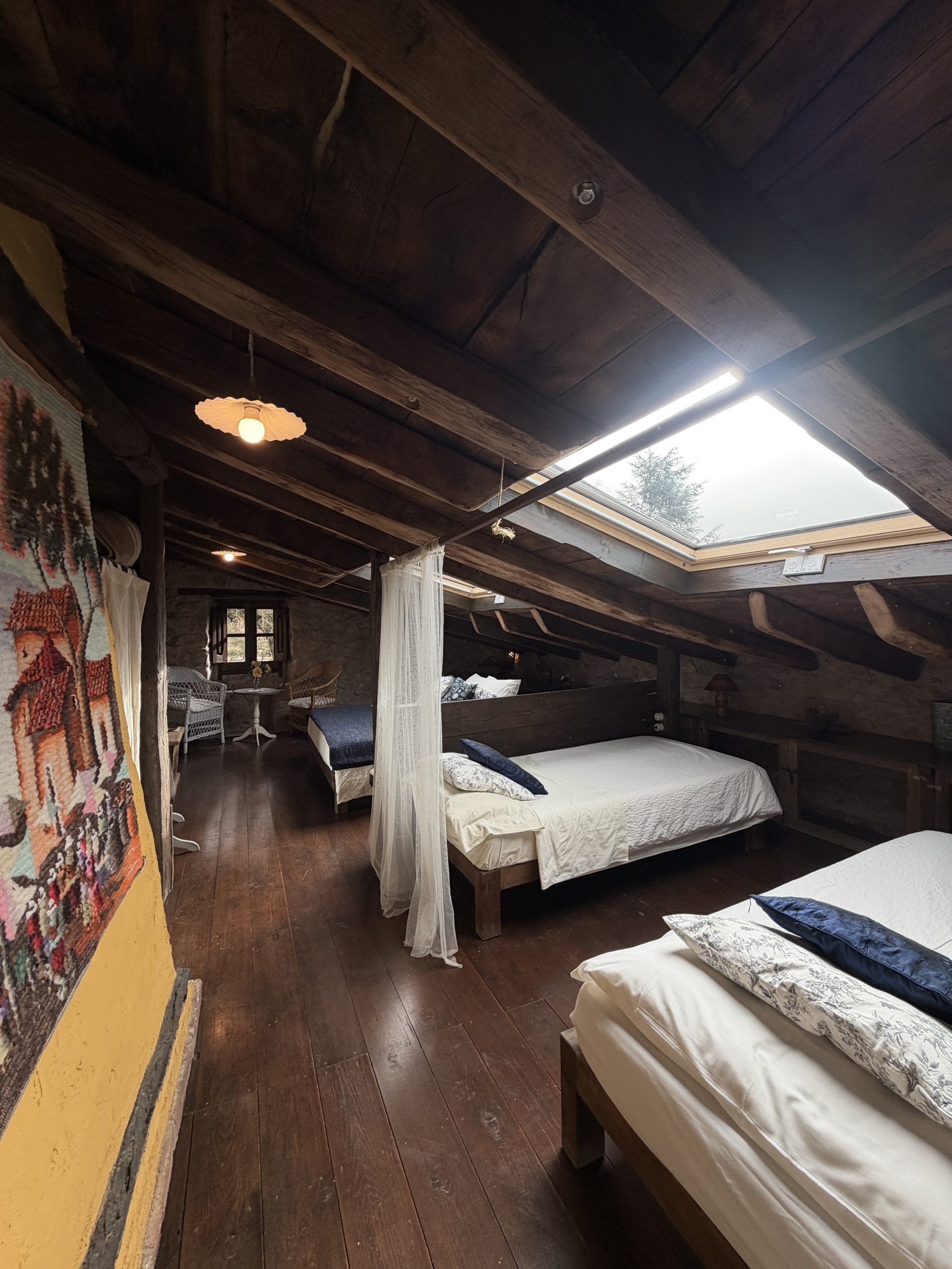 It has got a special smell of the ancient wood in the floor and in the ceiling; an original piece of furniture with the shape of a cage with hen-house yarn gives it a extraordinary charisma. From one of the beds, we can see the stars through the small skylight or contemplate the mountain Montseny just sunbathing in the balcony.