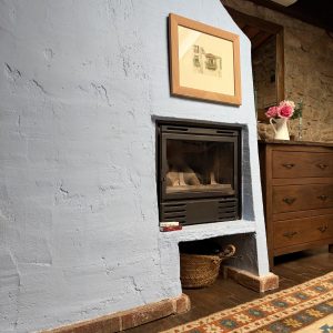 Amb el seu llit doble amb dosell, calaixera i tauleta de castanyer, tot fet al taller de la masia, el terra d'autèntiques llates de roure.