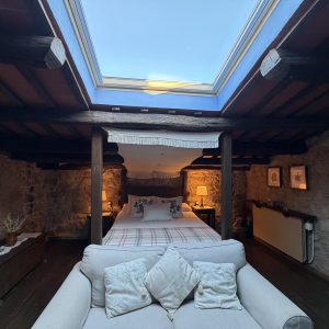 It has got a double bed with canopy, chest of drawers and night table, everything made of chestnut and done in the workplace of the country house. The floor is made of real oak tins.