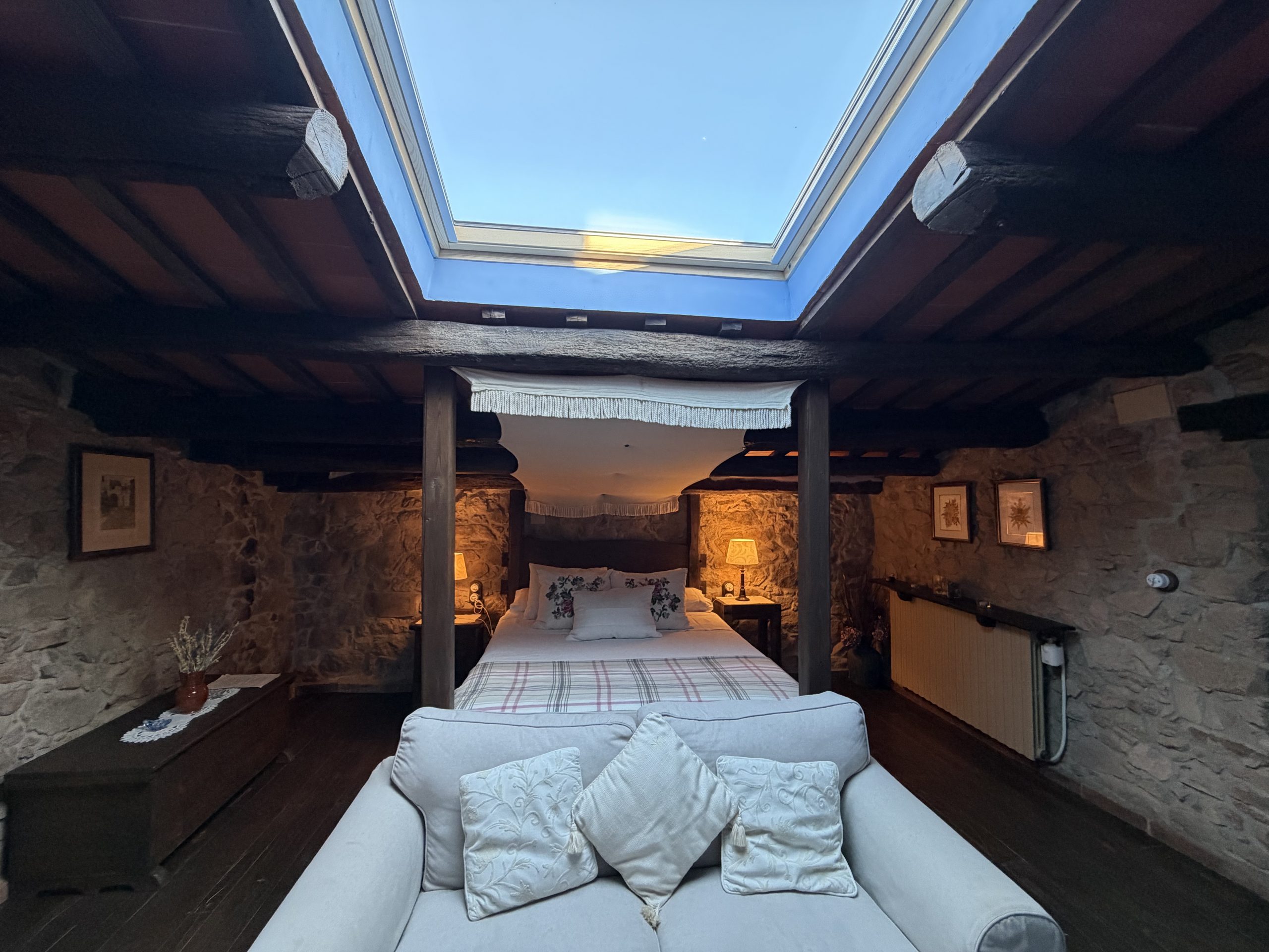 Amb el seu llit doble amb dosell, calaixera i tauleta de castanyer, tot fet al taller de la masia, el terra d'autèntiques llates de roure.
